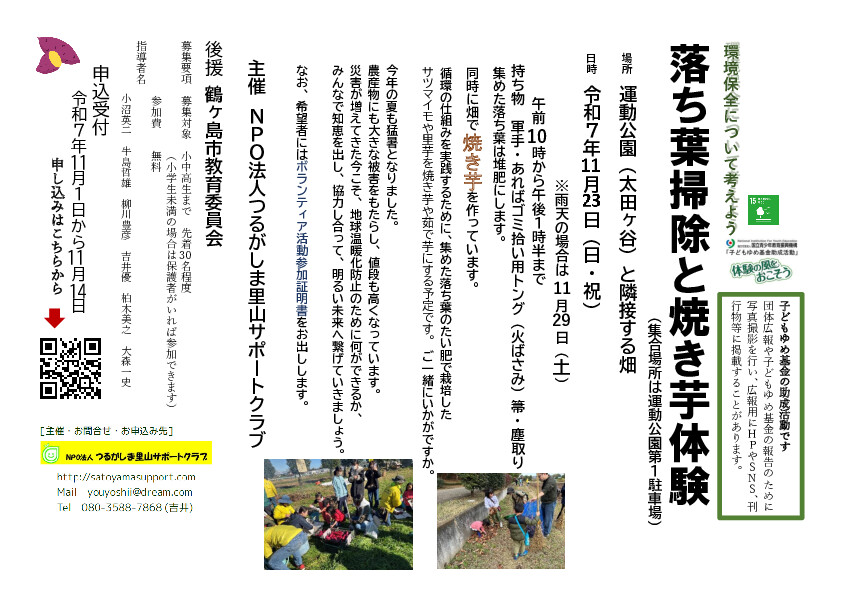 | 11/23(日)9:00 | 運動公園駐車場 ・落ち葉清掃。焼き芋体験 |
